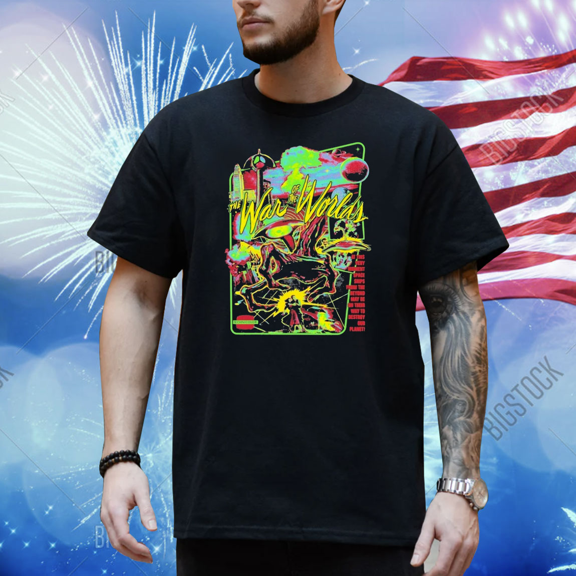 This unique shirt features a striking design inspired by the classic science fiction novel “The War of the Worlds” by H.G. Wells. The vivid technicolor invasion imagery of space ships descending upon Earth creates a sense of urgency and excitement, making it a must-have for fans of the genre.