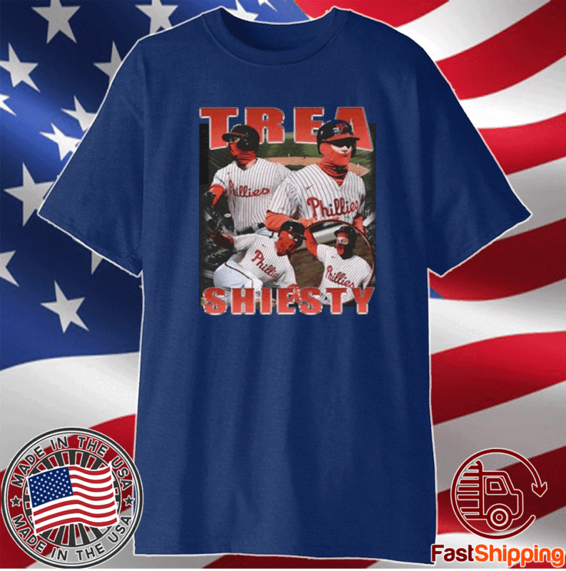 Introducing the Trea Shiesty Philadelphia Phillies T-Shirt, a must-have for any die-hard Phillies fan! Show your unwavering support for your favorite team and player with this stylish and comfortable tee.